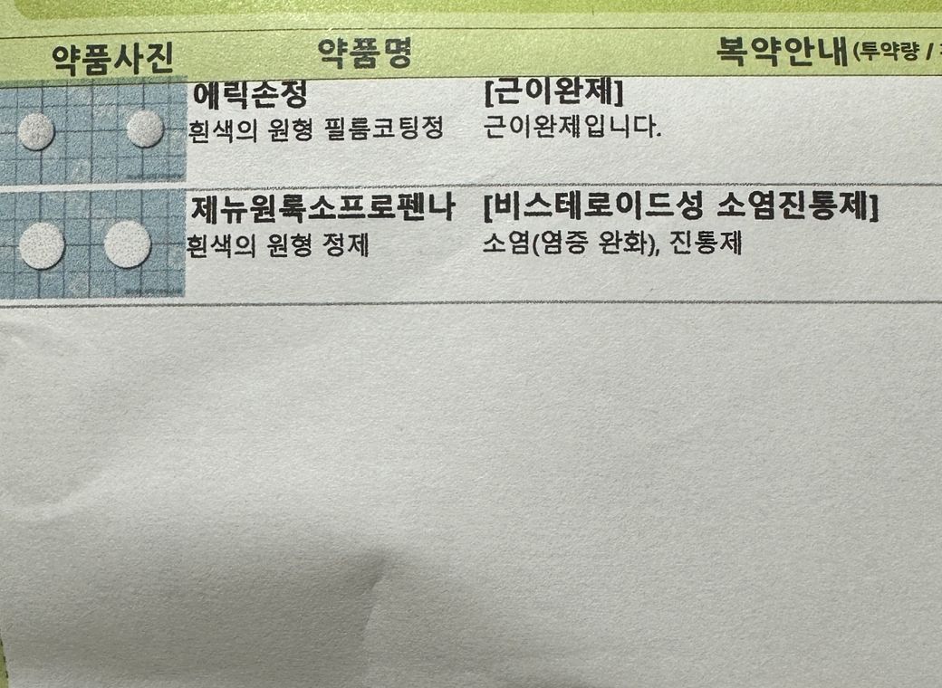 약 : 에릭손정 (근이완제) , 제뉴원록소프로펜나 (비스테로이드성 소염진통제)