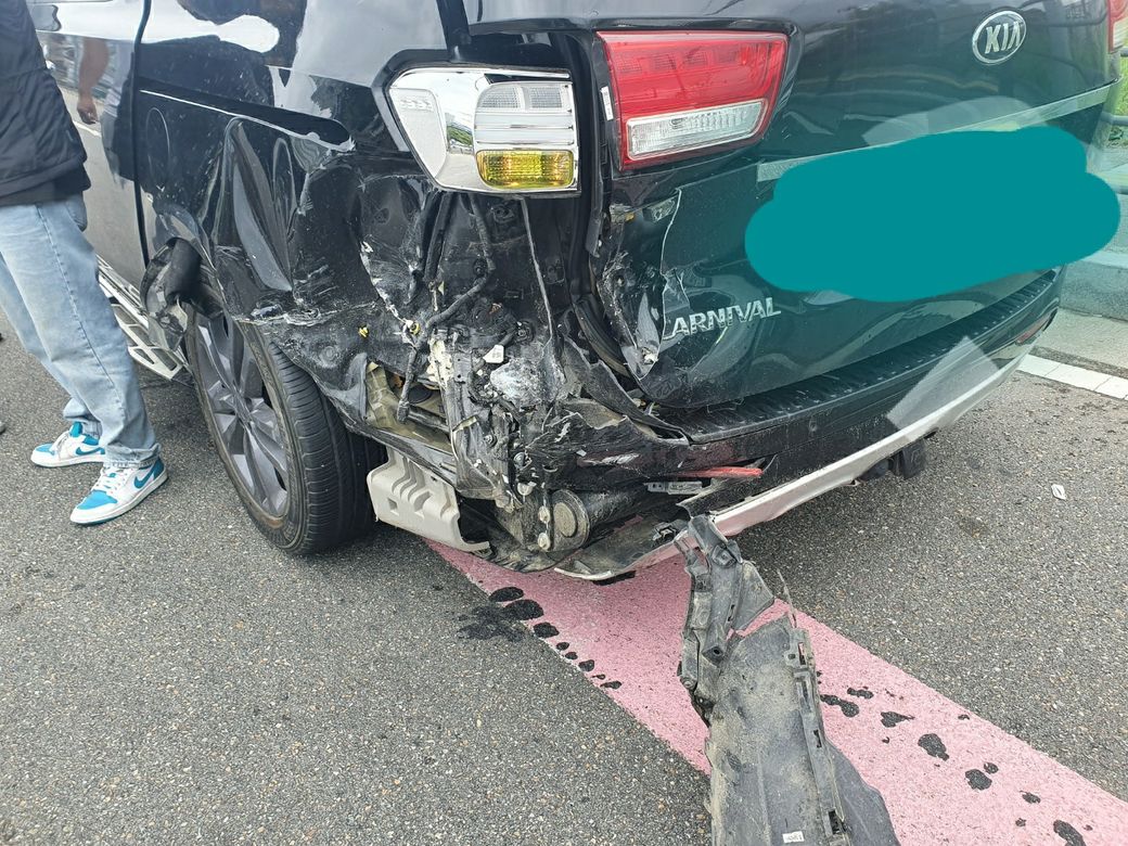 고속도로 주행 중 앞에서 정체되어서 속도를 줄였는데 비상깜빡이를 켰는데요, 근데 뒷 차가 옆 차선을 밟으면서 운전석 뒤쪽으로 속도줄임없이 그냥 들이박았어요. 사진은 사고 당시 저희 차 상태입니다.
