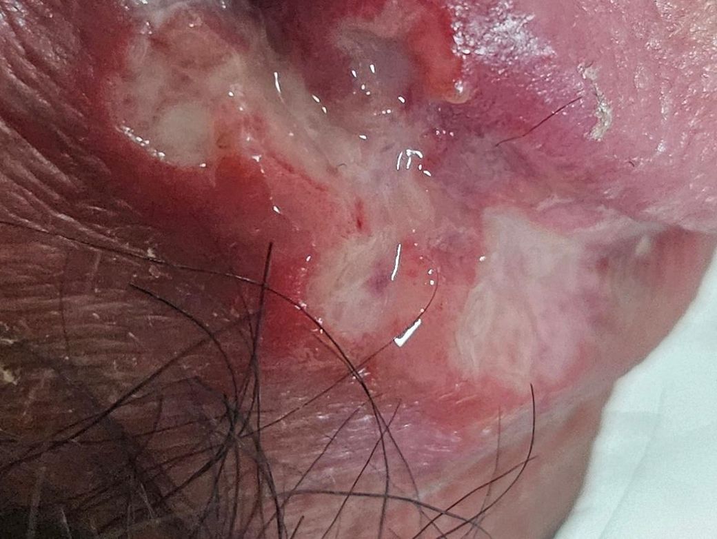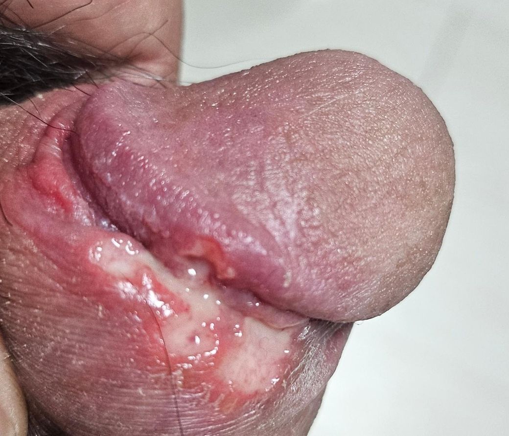사진과 경과 설명을 종합하면 단순 마찰성 표피염을 넘어 점막 손상이 반복되면서 궤양화된 상태로 보입니다. 이 부위는 피부가 아닌 점막에 가까워 회복이 느리고, 작은 자극에도 극심한 작열감과 통증이 나타나는 것이 흔합니다. 성관계 직후 재발했고 물이나 접촉만으로도 심한 통증이 있는 점은 상처가 완전히 아물기 전에 다시 마찰이 가해졌다는 의미로 해석하는 것이 합리적입니다.