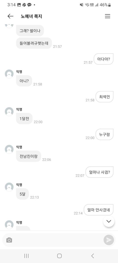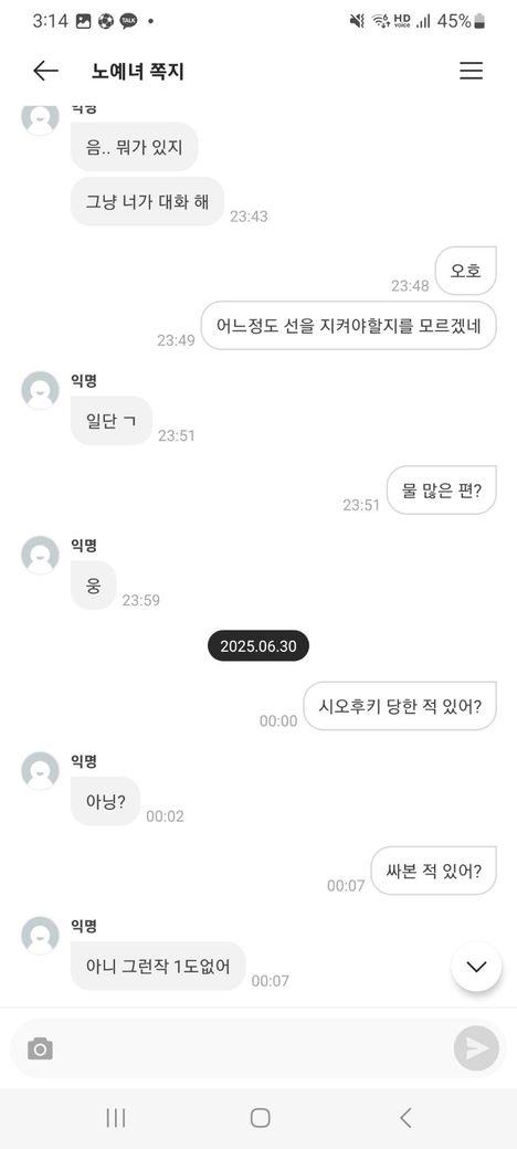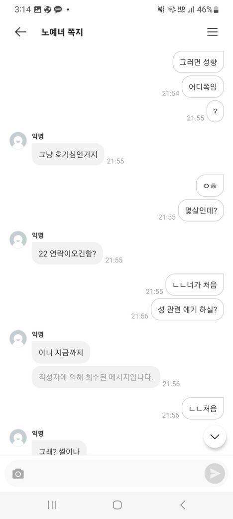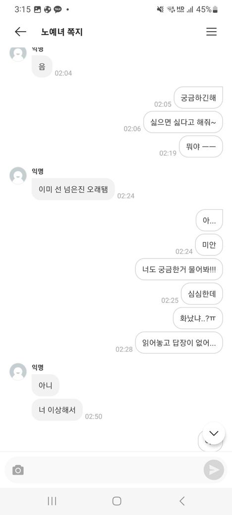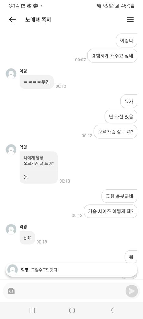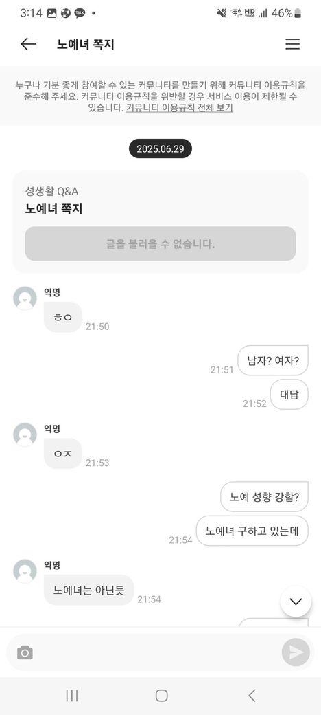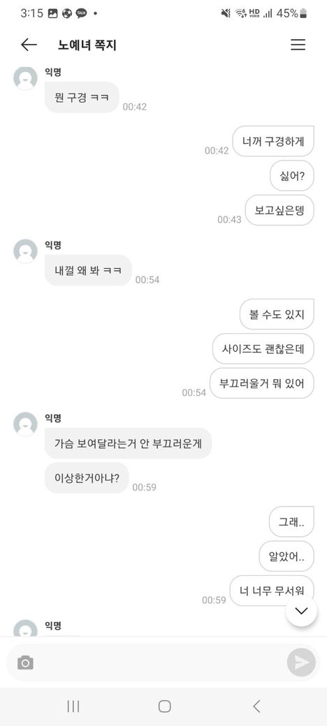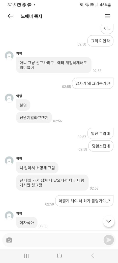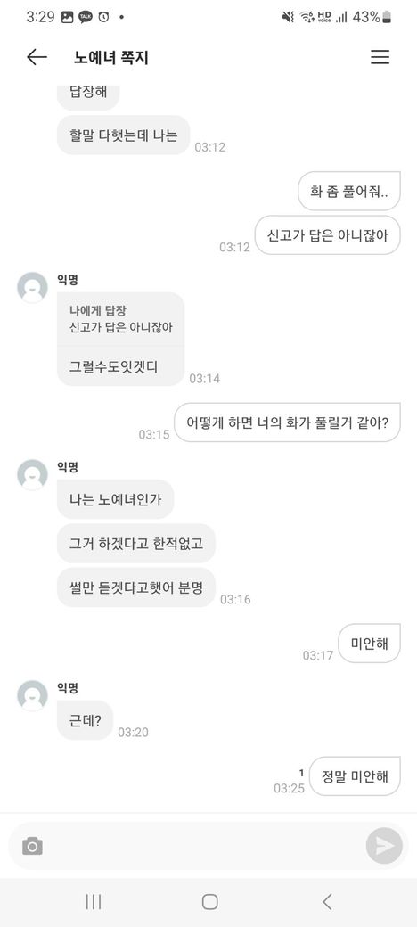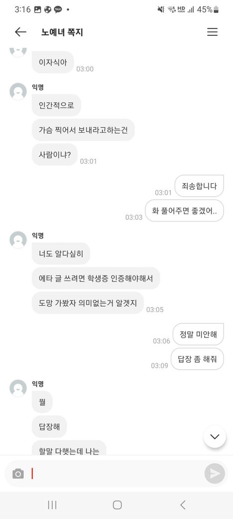 제가 25.6.29일에 에브리타임 성생활 게시판에 노예녀 구한다 쪽지해라라는 글을 올렸습니다. 그 후에 익명인이 쪽지가 왔어요 사진과 같은 대화를 나눴고 갑자기 신고한다고 합니다. 통매음 고소가 성립될 확률은 얼마정도 될까요? 현재 잠도 안오고 정말 힘드네요. 잘못된 행동인걸 알아서 많이 반성중입니다. 답변 꼭 좀 부탁드릴게요