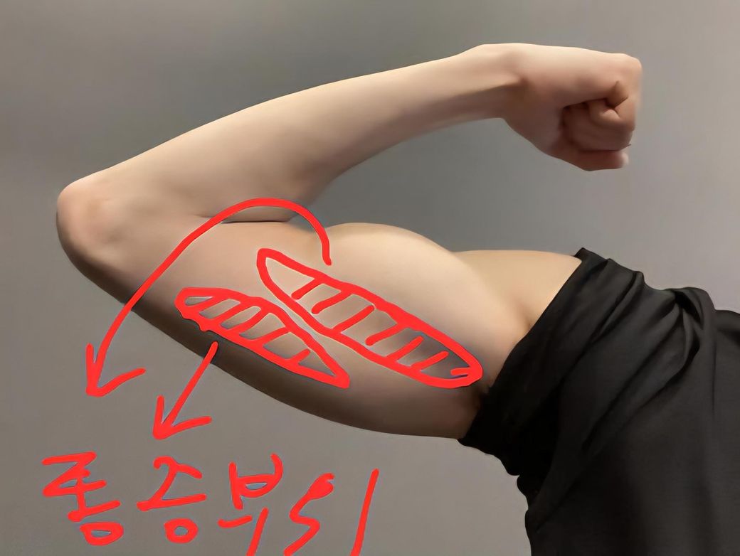 무리한 반복 사용이나 좋지 않은 자세, 무거운 중량의 운동으로 인하여 상완근에 근피로가 쌓였거나 손상이 있으신 것 같습니다.