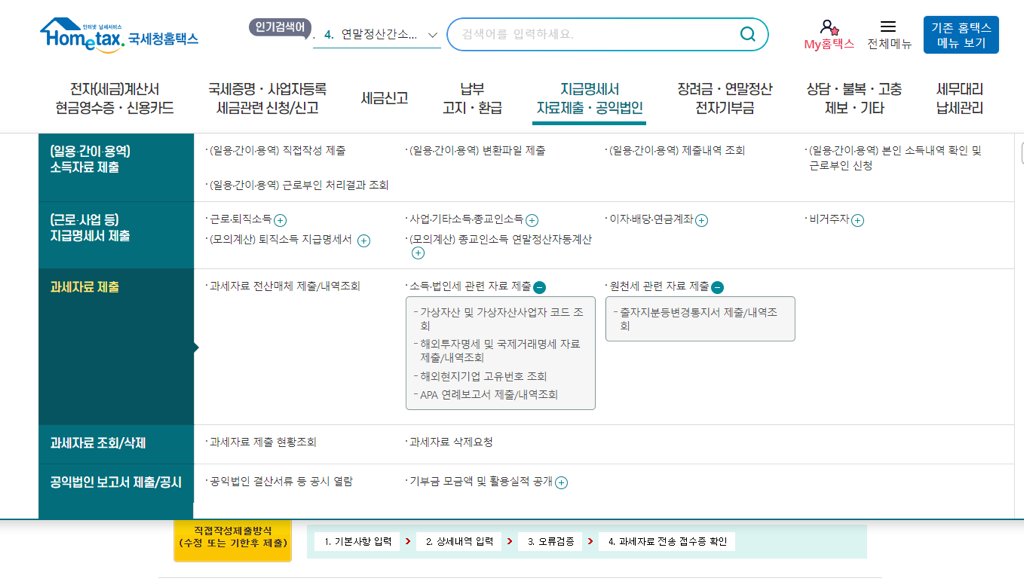 중소기업취업자에대한 소득세 감면 명세서 제출/내역조회 란이 검색되지 않아요 ㅠㅠ