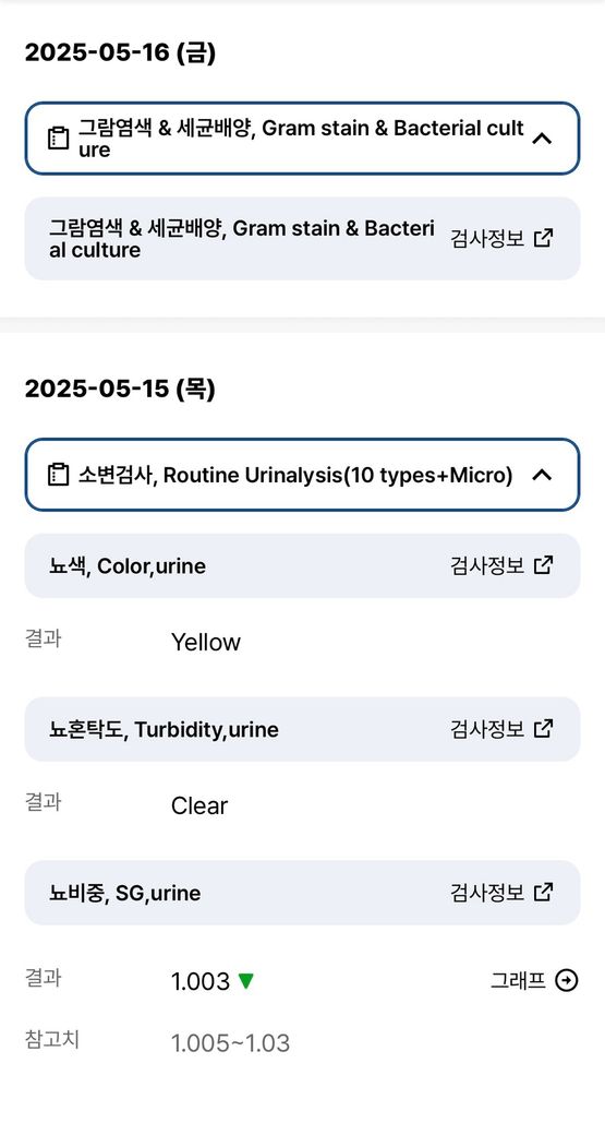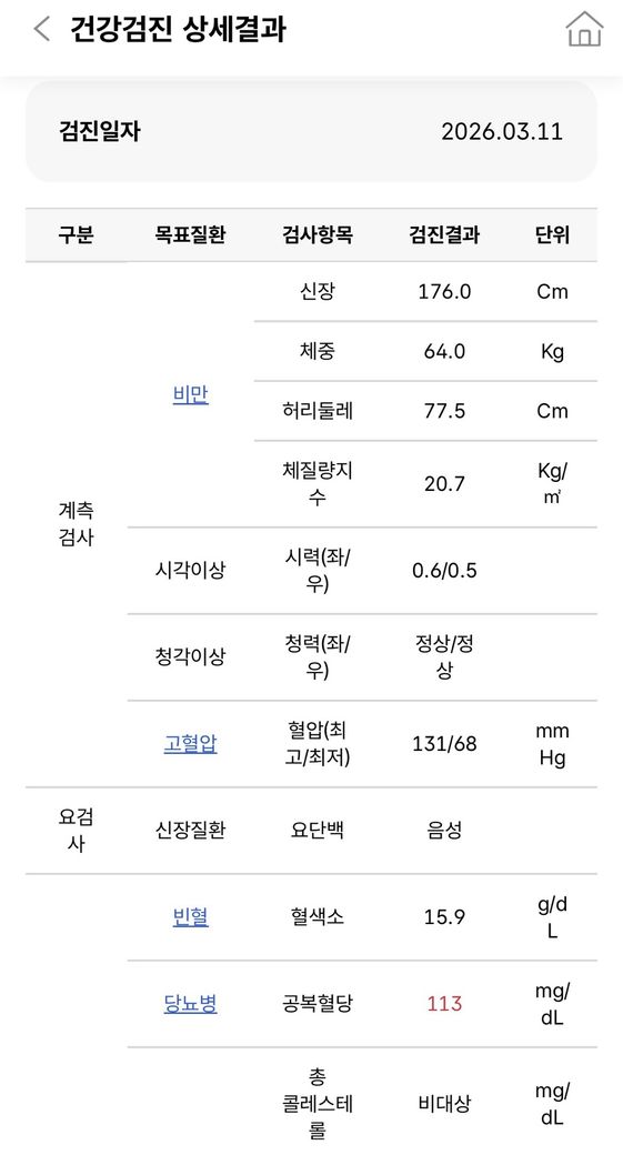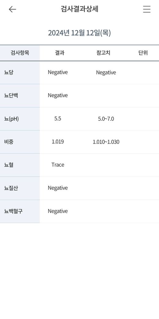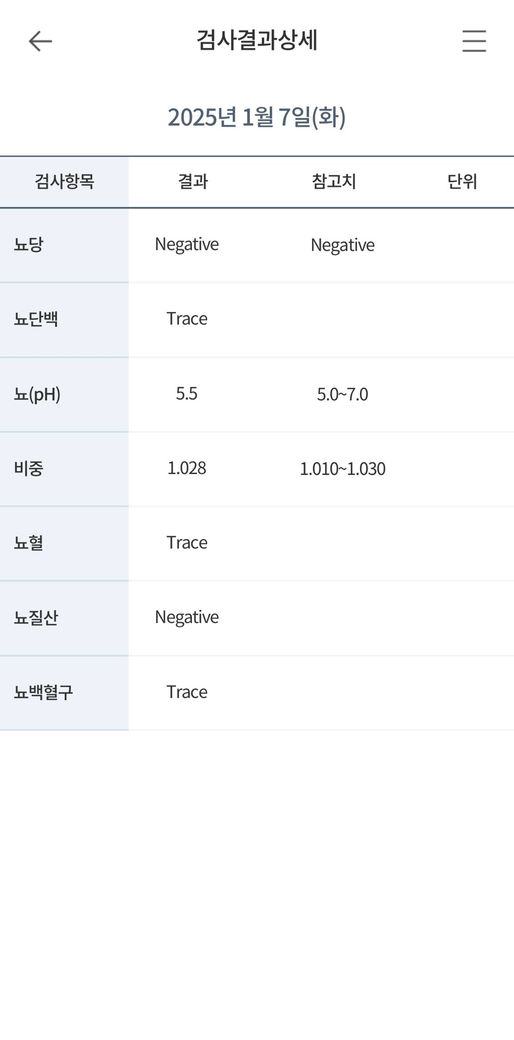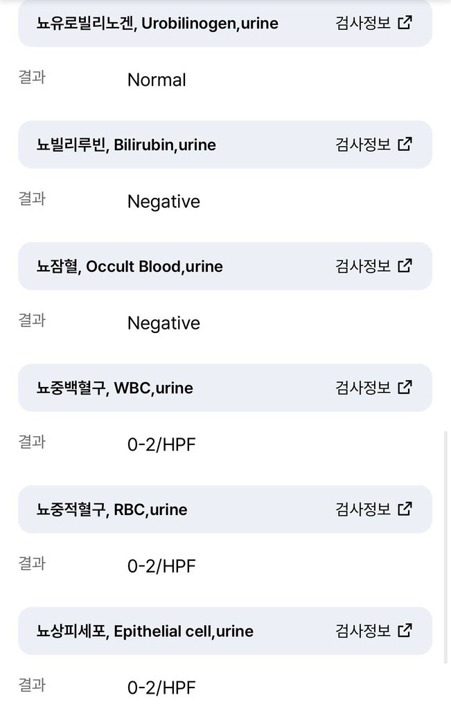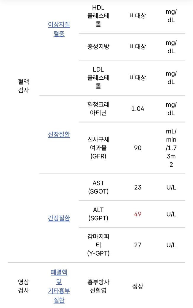 지금까지의 검사에서 신장기능은 비교적 안정적입니다. 크레아티닌 1.04, 추정 사구체여과율 90이면 적어도 현재 시점에서 신기능 저하를 시사하지는 않습니다. 단백뇨도 건강검진에서 음성이었고, 최근 소변검사에서도 단백뇨가 음성입니다. 백혈구와 아질산염도 음성이어서 전형적인 세균성 요로감염 양상은 아닙니다. 따라서 “결석 + 감염”보다는 “결석에 의한 기계적 출혈” 쪽이 더 자연스럽습니다. 다만 건강검진 사진의 ALT 49는 경도 상승이지만 혈뇨와 직접 연결되는 소견은 아니며, 공복혈당 113은 별도로 추적할 문제입니다. 현재 혈뇨 판단에는 핵심 소견이 아닙니다.