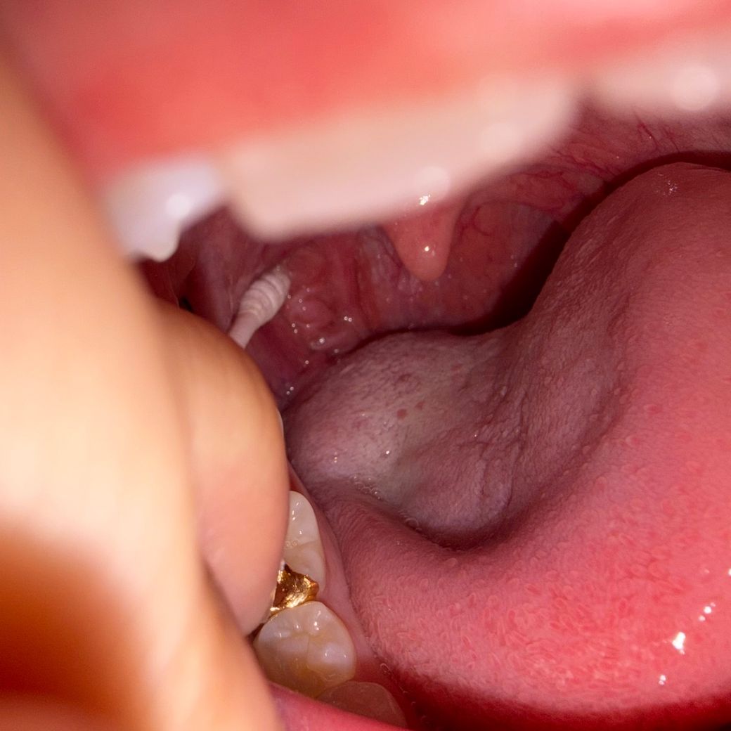 올려주신 사진만으로는 다소 제한적이나 면봉으로 가리키는 부위는 편도로 붓거나 염증 소견은 관찰되지 않습니다.