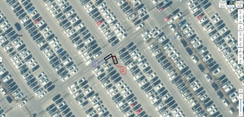 마지막 사진 흰색차량(1번) 뒤쪽 차선은 일방통행 2차선 도로이며, 양쪽 불법주차로 인해 1번 차량이
