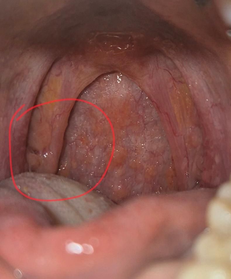 현재 사진상으로는 표시해 둔 부위의 발적과 점막의 변화가 보이는 상태입니다. 이런 경우 보통 급성 인후두염에 의한 증상일 가능성이 있지만 이와 별도로 해당 표시된 부위에서 점막 자극이 과도하게 되면서 일부 부위의 발적이 생겼을 가능성이 있습니다.