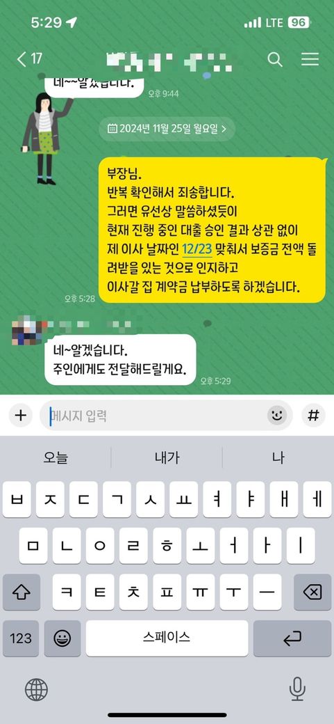 현재 살고 있는 집주인이 남은 계약금(새집 계약금-650만원)을 주기 어렵다고 했고, 대신에 새입자의 대출과 상관없이 12.23일에 맞춰서 남은 보증금을 돌려주겠다고 말했습니다.(카톡 기록 있음)