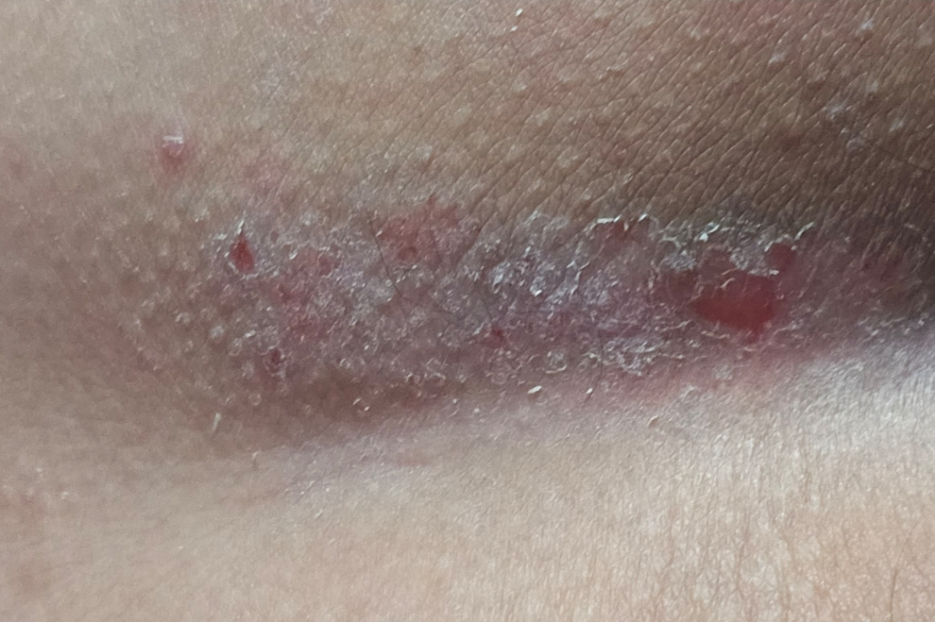대상포진이나 한포진은 아닌 것 같고 습진성 병변이 추정되므로 피부과를 방문해 진찰받아보시기를 권해드립니다.