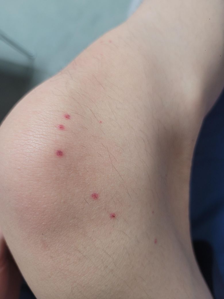 다리에 붉게 점들이 있습니다 자세히 보면 가운데 상처가 있고 그 주위에 붉게 물들어 있는데 뭘까요?? 무릎 바깥쪽과 종아리 뒷부분에 있습니다