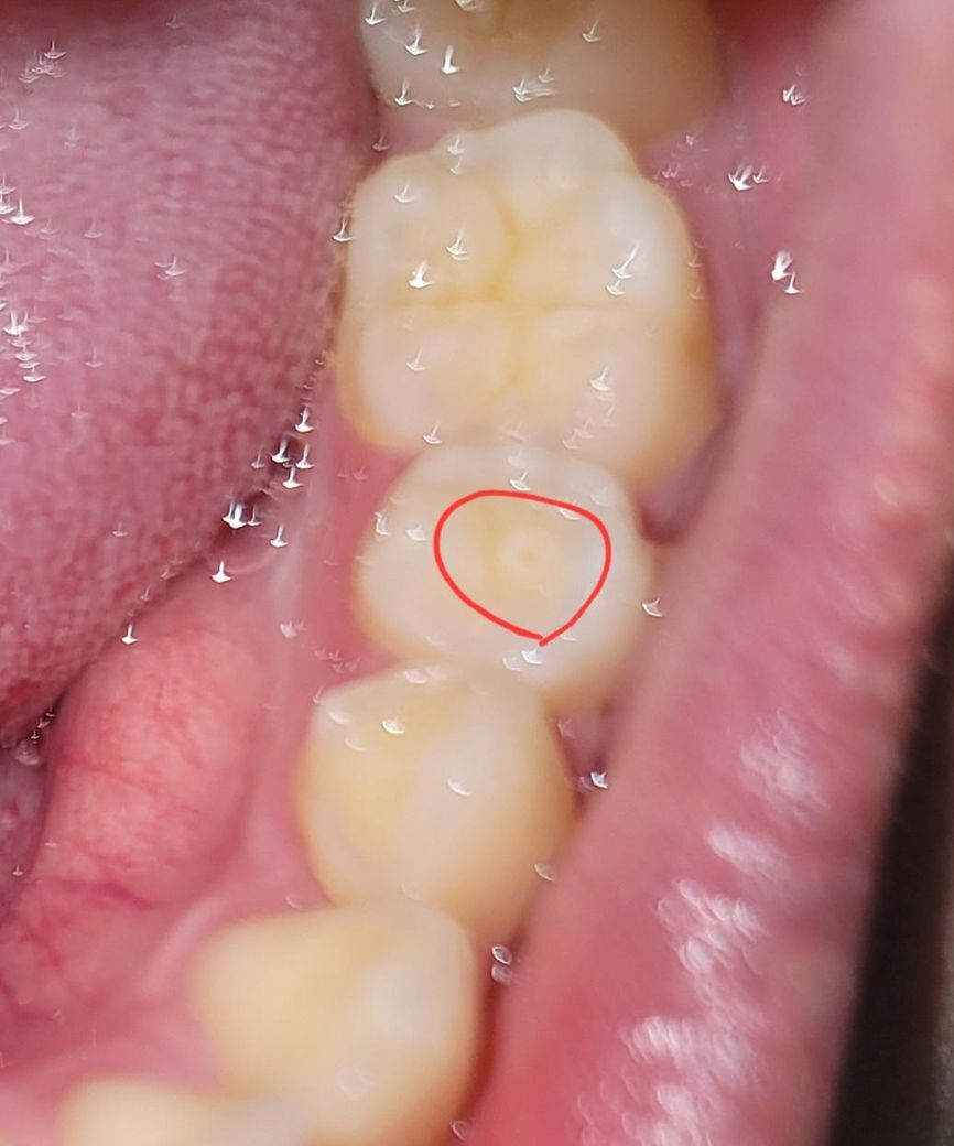 사진상으로 보아서는 정확히 알 수 없으나 초기 충치 정도로 보입니다. 다만 해당 치아는 치외치나 치내치일 가능성이 큽니다. 이러한 경우에는 조금만 구멍이 있더라도 신경과 상대적으로 가까워서 시린 증상이나 통증이 나타날 수 있습니다.