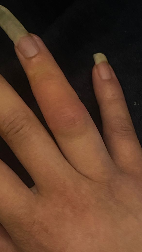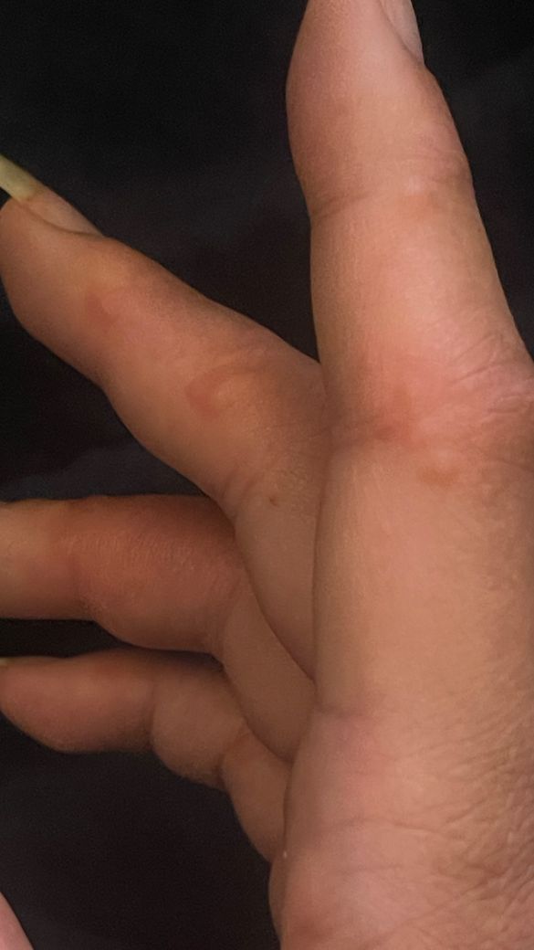 10월 29일, 젓가락을 쓰며 마라탕을 먹는 중 오른손이 빠르게 화해지며 즉각 반응을 보였습니다. 손바닥의 색이 붉어지고, 오른손이 붓고, 특히 넷째 손가락 손톱 경계까지 붓고, 여러 손가락 (엄지 방향)안쪽에 수포가 생겼음을 발견합니다.