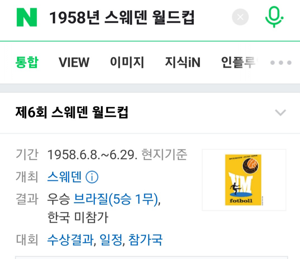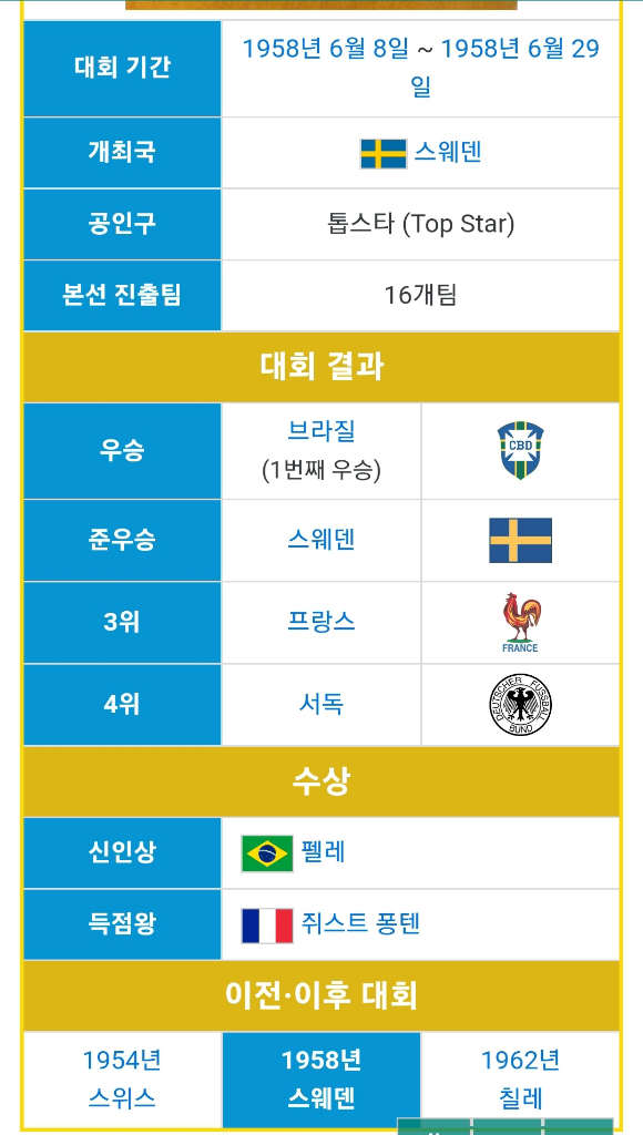 1958년에는 세계 2차 대전중이였고 스위스와 마찬가지로 스웨덴이 중립국이였으므로 6/8~6/29까지 개최되었다고 합니다.