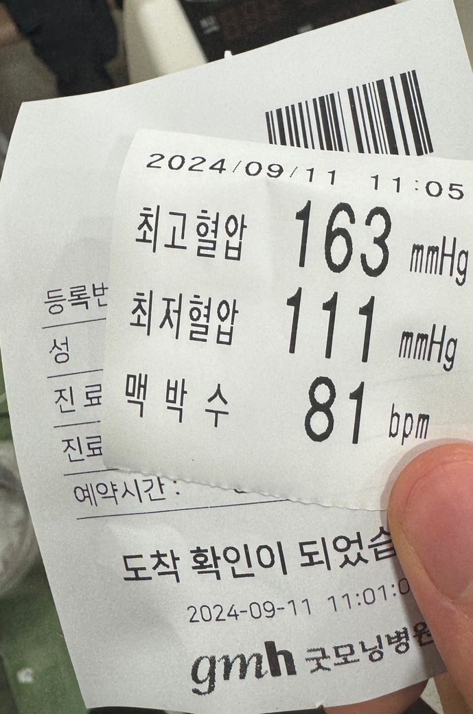 혈압이 꽤 높네요. 163/111은 2단계 고혈압에 해당해요. 정상 혈압이 120/80 이하인 걸 생각하면 많이 높은 편이에요. 이 정도면 약물 치료가 필요할 수 있어요. 현재 생활 습관이 혈압을 더 높이는 것 같아요.