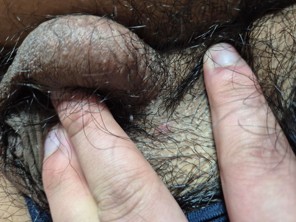 사진 병변은 털이 있는 음모 부위에서 발생한 작은 홍색 구진 형태로 보입니다. 중심에 모낭이 위치하는 양상이며 단일 병변에 가깝고 수포 군집은 관찰되지 않습니다. 이러한 형태는 임상적으로 모낭염 또는 인그로운 헤어(털이 피부 안으로 자라 염증이 생기는 상태)에서 흔히 보이는 모습입니다.