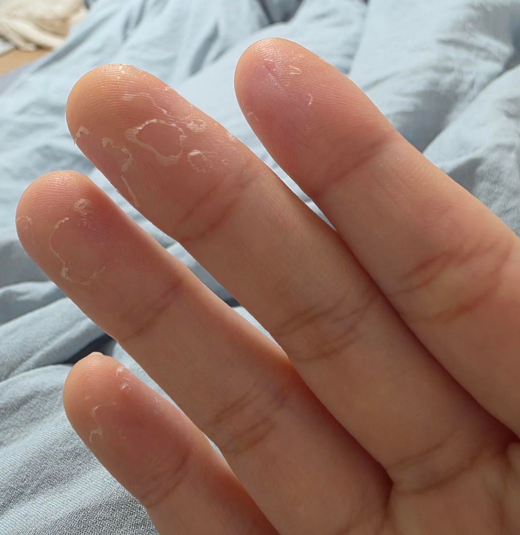 사진에서는 손가락 끝 부분에 얕은 원형 혹은 고리 모양의 각질 탈락이 보이며, 뚜렷한 홍반이나 진물, 균열은 두드러지지 않습니다. 이런 양상은 임상적으로 keratolysis exfoliativa(박탈각질용해증) 또는 irritant contact dermatitis 형태와 가장 유사합니다. 일반적인 손 습진 중에서도 물, 비누, 알코올 소독제 노출이 많은 경우에 흔히 발생합니다. 손발 다한증과 잦은 손 세정은 피부 장벽을 반복적으로 손상시키므로 충분히 유발 요인이 될 수 있습니다.