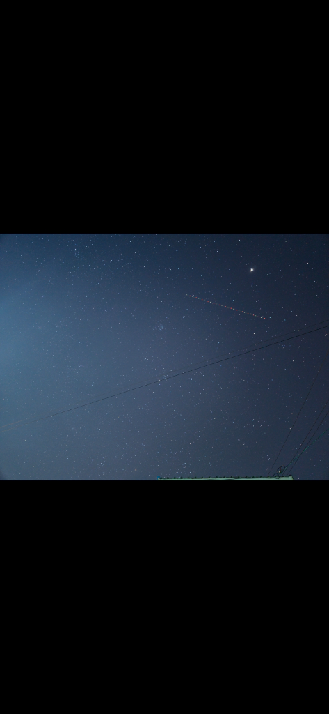 두번째 사진의 비행기가 지나간 자리의 윗부분에 밝게 보이는 것이 목성. 직선의 아래쪽-사진의 정중에서 약간 아래쪽-에 푸르스름하게 보이는 것이 플레이아데스 성단. 그 아래에 황소자리-플레이아데스와 사진의 아래면의 중간쯤-가 보입니다. 그리고 사진 아래바닥 부분에 보이는 붉은색 밝은 별은 오리온자리의 베텔게우스입니다.