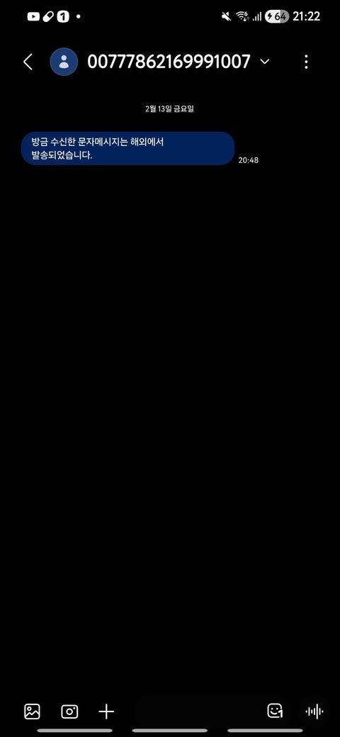 저도 여러 해외 스팸문자를 받았지만 방금 온 문자는 '방금 수신한 문자메시지는 해외에서 발송되었습니다.' 라고만 왔는데 이런건 처음이네요... 이런것도 스팸이나 피싱인가요?