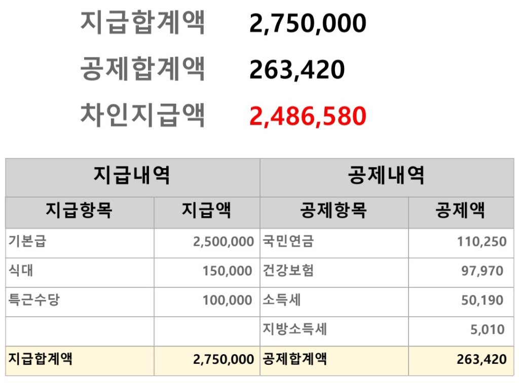 총 급여액은 비과세항목과 수당 등을 모두 합한 275만원이 됩니다.