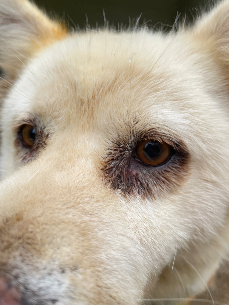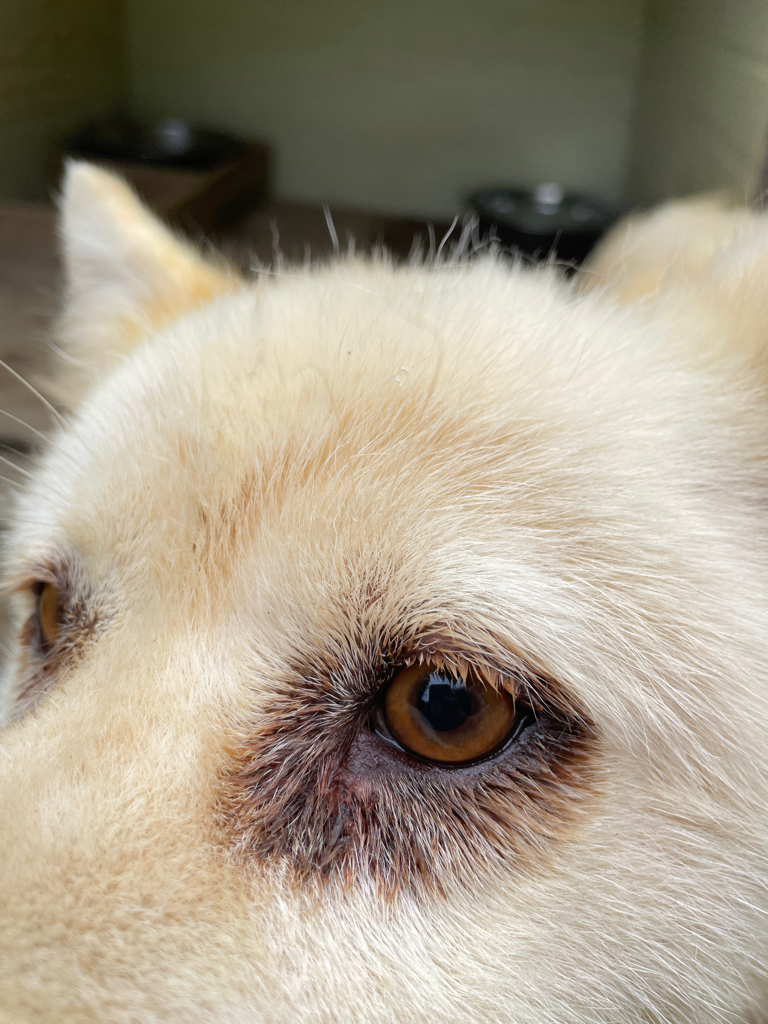 색소침착, 눈물에 의한 털의 변색, 알레르기 반응, 눈이나 눈 주변의 질환, 기생충 등등이 의심될 수 있습니다.