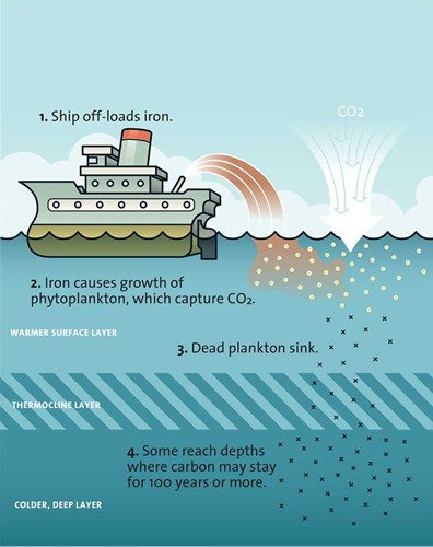 바다 철분 비옥화(Ocean Iron Fertilization, 이하 OIF로 줄임)는 비용이 저렴하고 이론적으로도 그럴듯하다는 평가를 받고 있다. OIF는 바다에 철분을 뿌려 식물플랑크톤 번성을 유도해 이산화탄소를 흡수하게 하자는 방안이다.