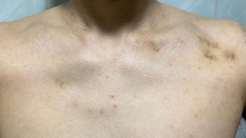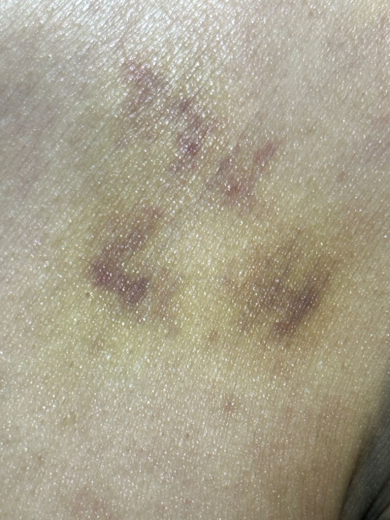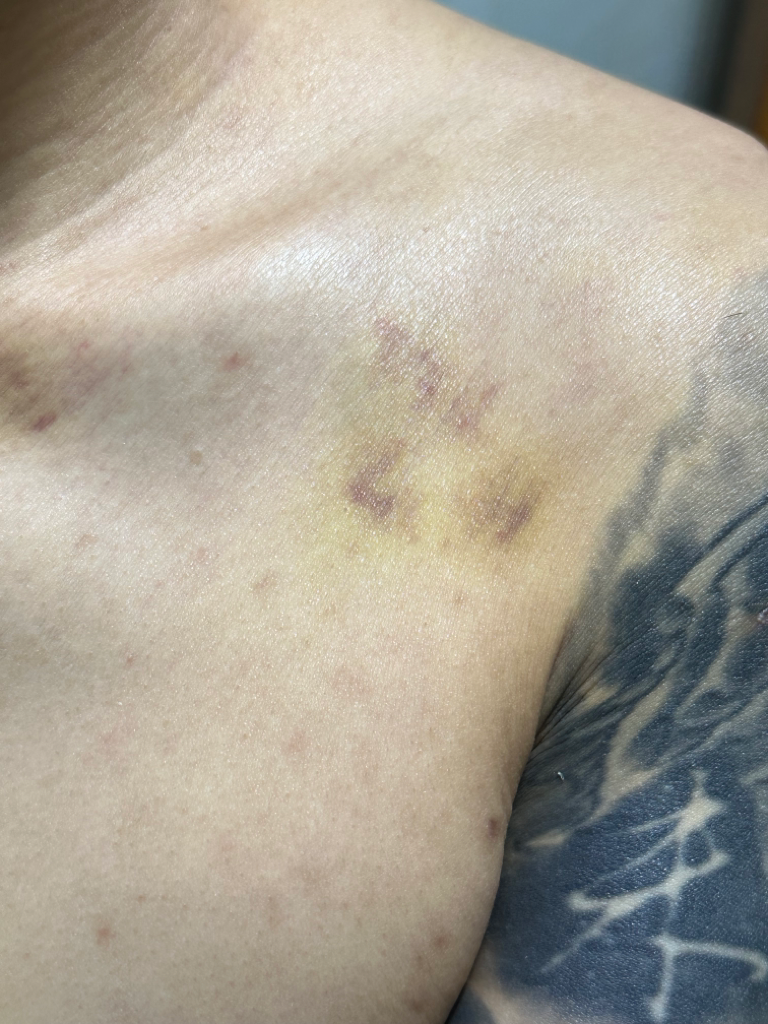 사진의 소견을 통해서 보았을 때에는 단순한 멍일 가능성이 가장 높아 보입니다. 모르는 사이에 어딘가 부딪히거나 충격을 받으셨을 가능성을 고려해보시길 바랍니다. 술이 잘 안 깨는 것과는 연관성이 낮아 보입니다.