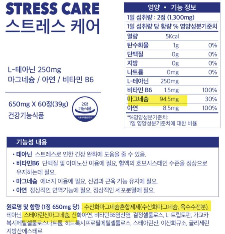 테아닌이 들어가니 당연히 도움은 되겠지만 마그네슘은 그 원료는 조금 들어가고 나머지는 산화마그네슘이라는 저가원료가 많이 들어가있을 가능성도 있어보입니다. 그래서 그닥 마그네슘 보충 목적으로는 좋아보이지 않습니다