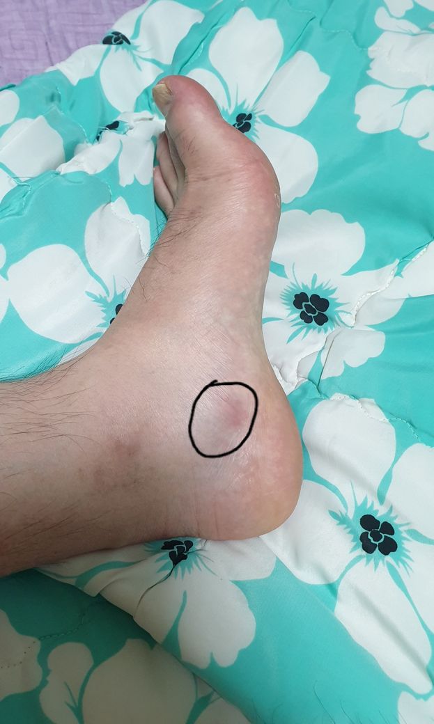 단순 타박상으로 생각됩니다. 2주 정도는 무리하지 마시고 다리를 올리고 주무시기 바랍니다. 냉찜질을 하면서 소염 진통제를 복용하시면 좋습니다. 통증이 지속된다면 정형외과에 가보시기 바랍니다.