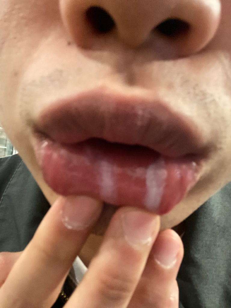 입술 점막 부위가 화상을 입으신 상태인 것으로 사료됩니다. 다만 손상의 정도가 심하지는 않으며 점막 부위는 재생이 빠르기 때문에 회복이 빠를 가능성이 높아 보입니다. 그렇지만 되도록이면 병원에 다니며 관리 받는 것이 아무래도 안전하게 치료를 하는 방법이겠습니다.