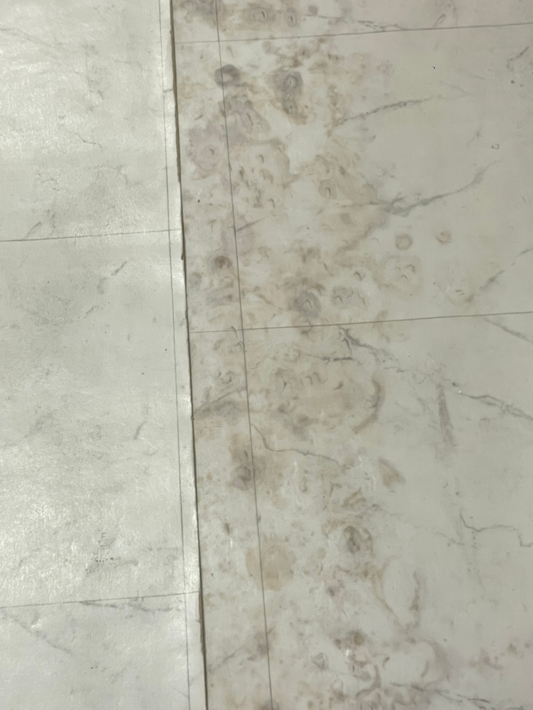바닥 창판에 본드 물질 자국으로 보입니다. 본드 자국을 제거 할때는 아세톤을 휴지에 발라서
