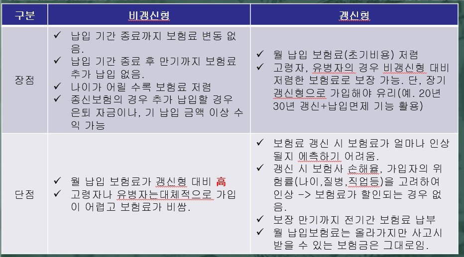 정리를 하면 갱신형은 평생내야하지만 저렴하고, 비갱신은 비싸지만 일정기간이 지나면 보장을 받고 입니다 ^^