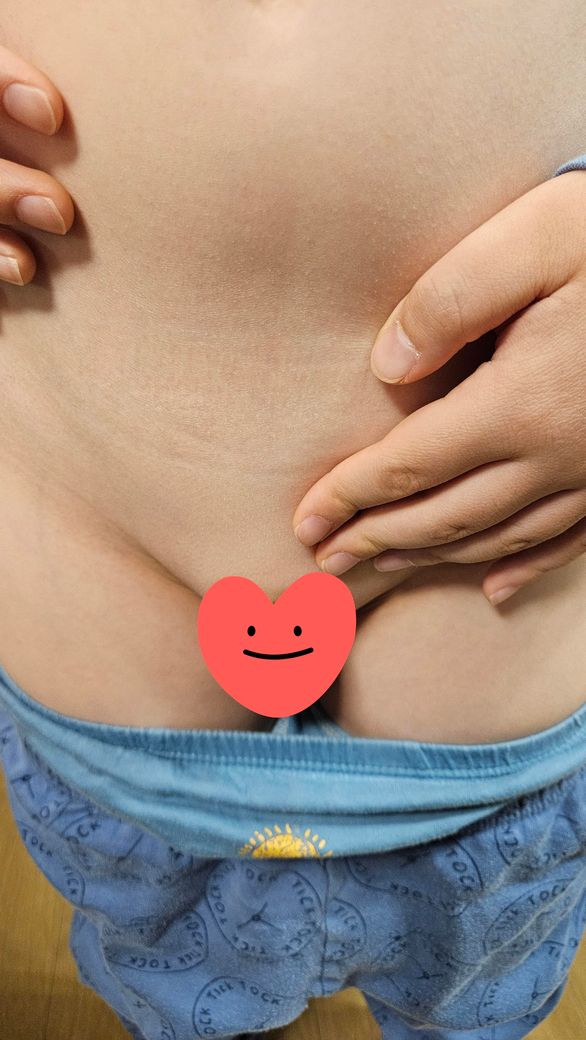 올려주신 사진으로 미루어 위치 상 불룩하게 튀어나오거나 만져 지는 덩이가 있다면 탈장의 가능성의 배제를 위하여 소아과나 외과 진료를 받아볼 것을 권합니다.