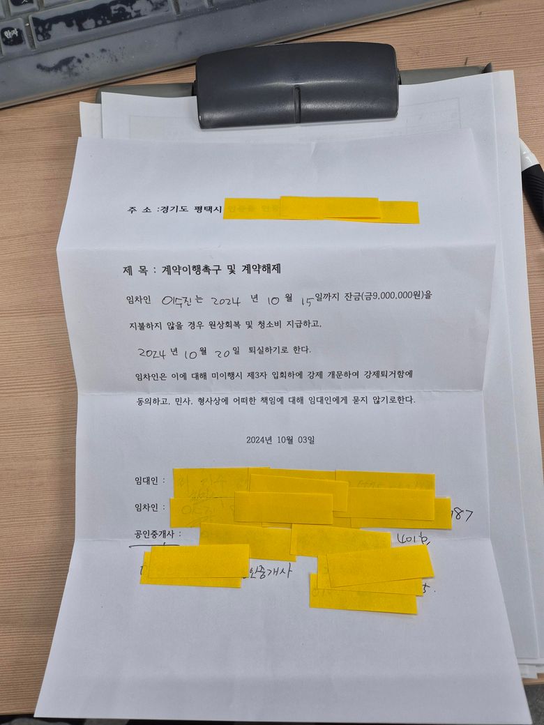 8월30일 1년간 월세 계약을 했습니다 1000만원130만원(주인세대) 100만원은 계약할때 받았습니다 부동산과 새로운 세입자가 연락이 왔어 기존 전세집에서 아직 전세금을 안주어서 그러니깐 입주하고 바로 저녁에 주겠다고 했어 입주시켰습니다.그런데 900만원을 한달이 지나 2달이가까이되도록 받지 못했습니다 이핑계 저핑계로 6번 7번 약속이 지켜 지지 않고 있습니다 그리고 월세도 받지 못하고 있고요 그래서 10월3일 공인중개사 사무실에서 세입자 저,세입자 계약이행 촉구 및 계약해지 문서을 작성했습니다