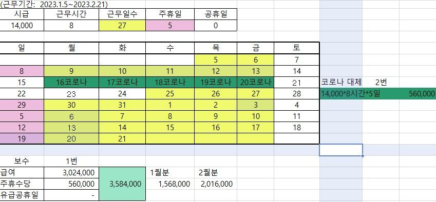 23.1.5~23.2.21까지 시급14,000원 하루8시간 으로 계약했구요(1번분)