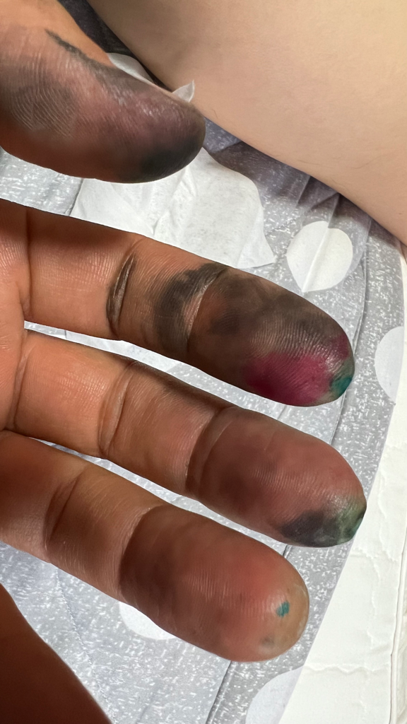 잉크 자국에 손 세정제를 뿌린 후 작은 동그라미 모양으로 문질러 주시면 됩니다. 손 세정제에 첨가된 알코올이 잉크를 용해해줍니다.