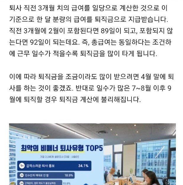 퇴직금은 계속근로기간 1년에 대하여 30일분 이상의 평균임금으로 지급해야 하는 바, 평균임금이란 이를 산정해야할 사유가 발생한 날 이전 3개월 동안에 그 근로자에게 지급된 임금총액을 그 기간의 총일수로 나눈 금액을 말합니다. 즉, 평균임금 산정 시 분모인 3개월 총일수가 적을수록 평균임금이 높아지므로, 월일수가 적은 2월이 3개월 기간에 포함되도록 퇴직일자를 정하면 됩니다. 다만, 이는 분자인 임금총액이 매월 고정적일 때를 가정한 것이므로 반드시 그런 것은 아니라는 점 알려드립니다.