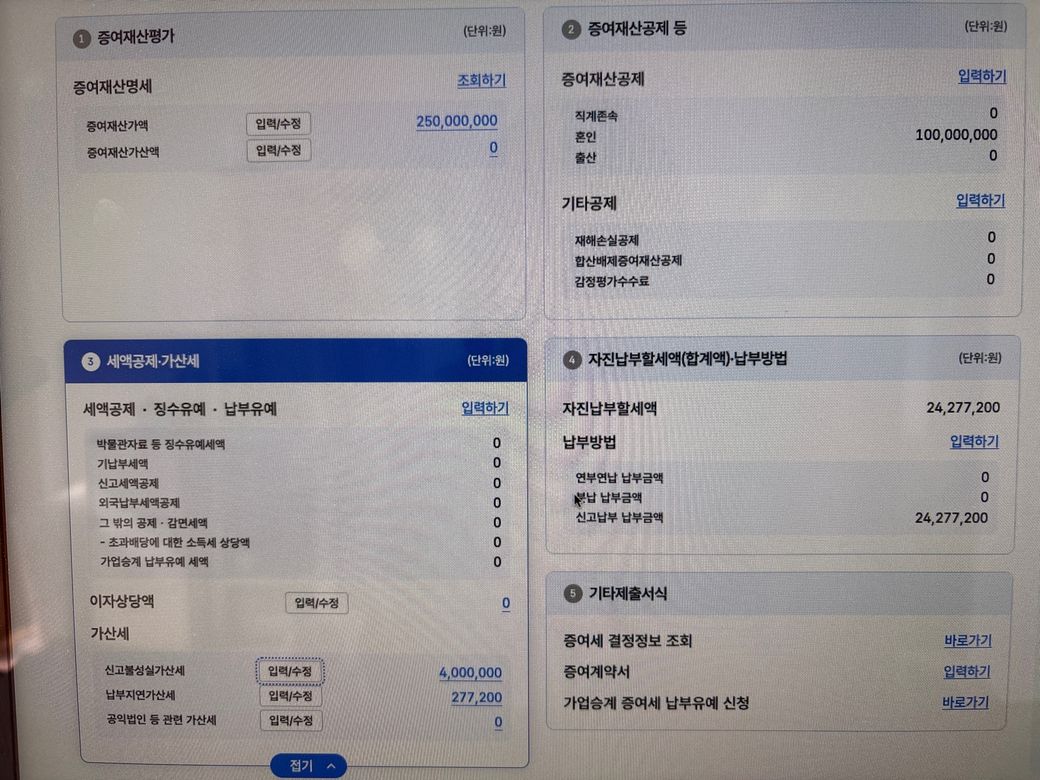 2. 만약, 증여받은 재산이 현금이나 주식이라면 기한후신고 하지 마시고, 다시 돌려드린 후에 새롭게 이체받아 정기신고하시면 됩니다.