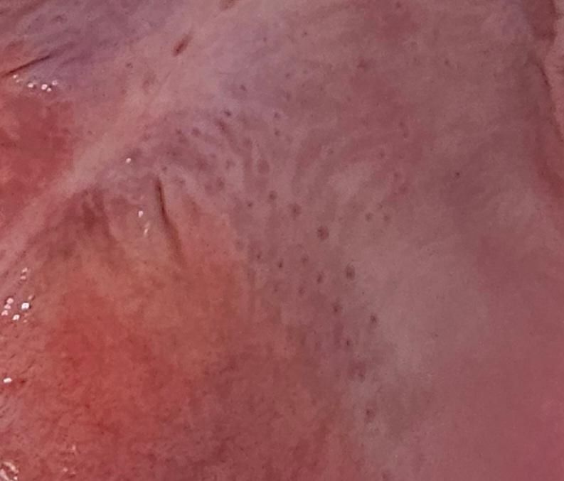 사진으로 보이는 부분은 점막에 있는 타액선이나 분비샘으로 보입니다. 문제가 되는 것은 아닐 것으로 생각되나 걱정이 되신다면 치과에서 진료를 받아보는 것으로 권유드립니다.