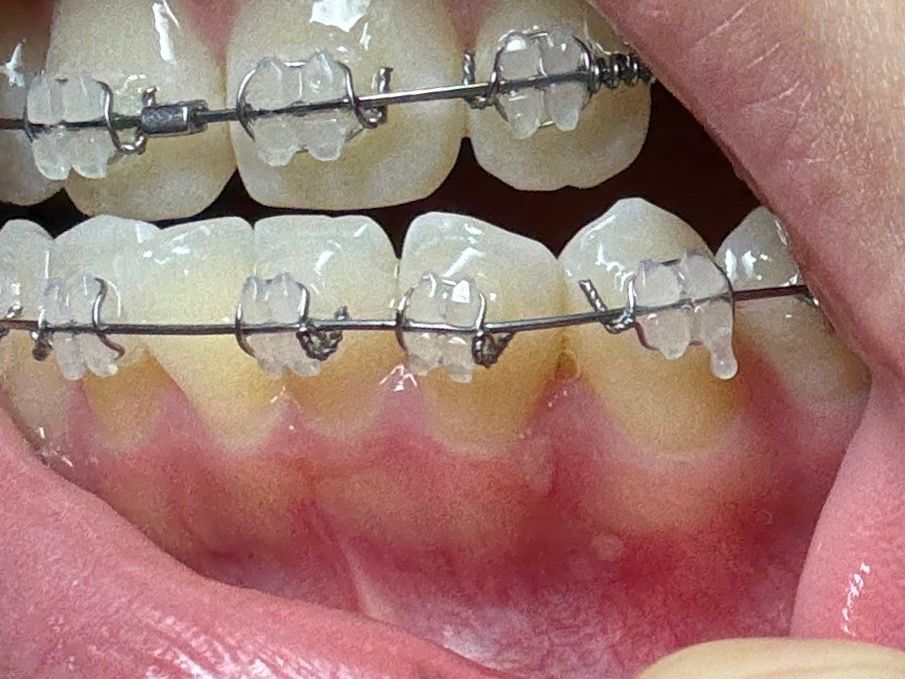 화요일에 교정 치과 다녀온 날인가 그 다음날인가부터 양치할 때 아팠는데 확인해보니까 잇몸에 저렇게 하얀 부분이 두개 생겼더라구요