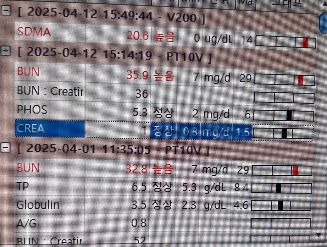 SDMA가 높더라도 반드시 신장 질환을 의미하는것은 아니며 https://diamed.tistory.com/1208 다른 질환 가능성도 고려해야 합니다. 특히 BUN은 상승했음에도 불구하고 Creatinine은 정상이라면 신장 질환보다 다른 질환 가능성을 고려해야 합니다. https://diamed.tistory.com/17 1살령의 경우 유치가 남아서 치아에서 출혈이 있는 경우 BUN이 튀는 경우가 종종 있으니 치과 검진을 받아 보시는걸 추천합니다.