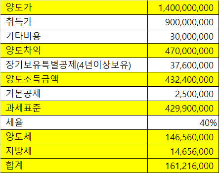취득가액은 9.3억원이고, 양도가액은 14억원이며, 보유기간은 4년으로