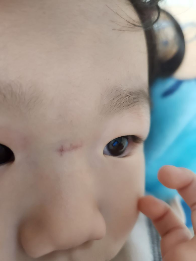 사진을 통해서 보았을 때에는 단순 흉터일 가능성이 높아 보입니다. 봉합사가 남아있었다면 지난 50일 사이에 염증이 생기는 등 문제가 있었을 가능성이 높습니다. 아이의 흉터가 서서히 회복되며 최대한 적게 남길 기원하겠습니다.