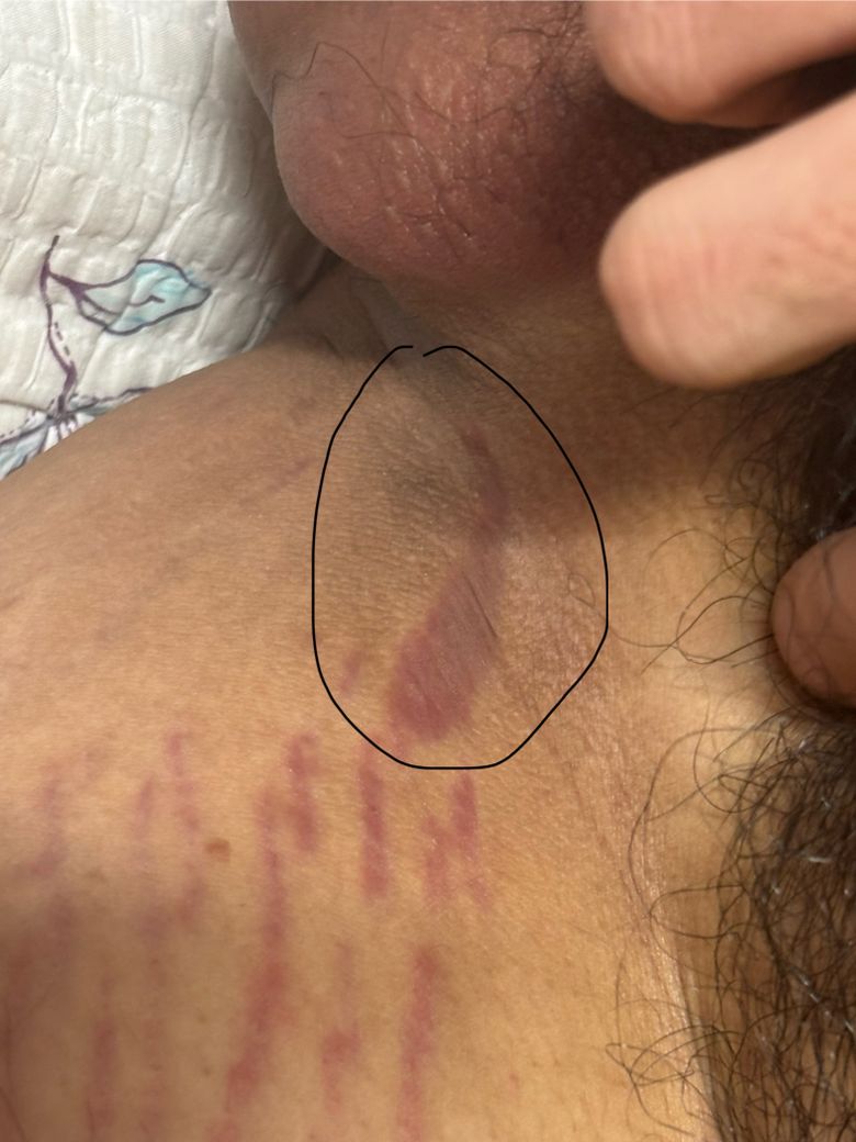 현재 사진으로 보았을 때 헤르페스 2형에 의한 전형적인 수포 양상으로 보이진 않으며 사타구니의 튼살과도 큰 연관성은 없어 보입니다. 다만 기둥쪽에 이전에 진물이 났던 병변이 있었다면 피부의 염증성 질환을 생각해 봐야 할 수 있겠으며 현재 표시하신 부위는 이후에 치유되면서 남은 상흔일 가능성이 있습니다.
