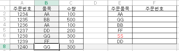 우측의 주문번호란에 주문품목과 일치하는 모든(일치하는 값이 여러개면 모두 포함) 주문번호를 넣을수 있는 함수 좀 알려주세요.