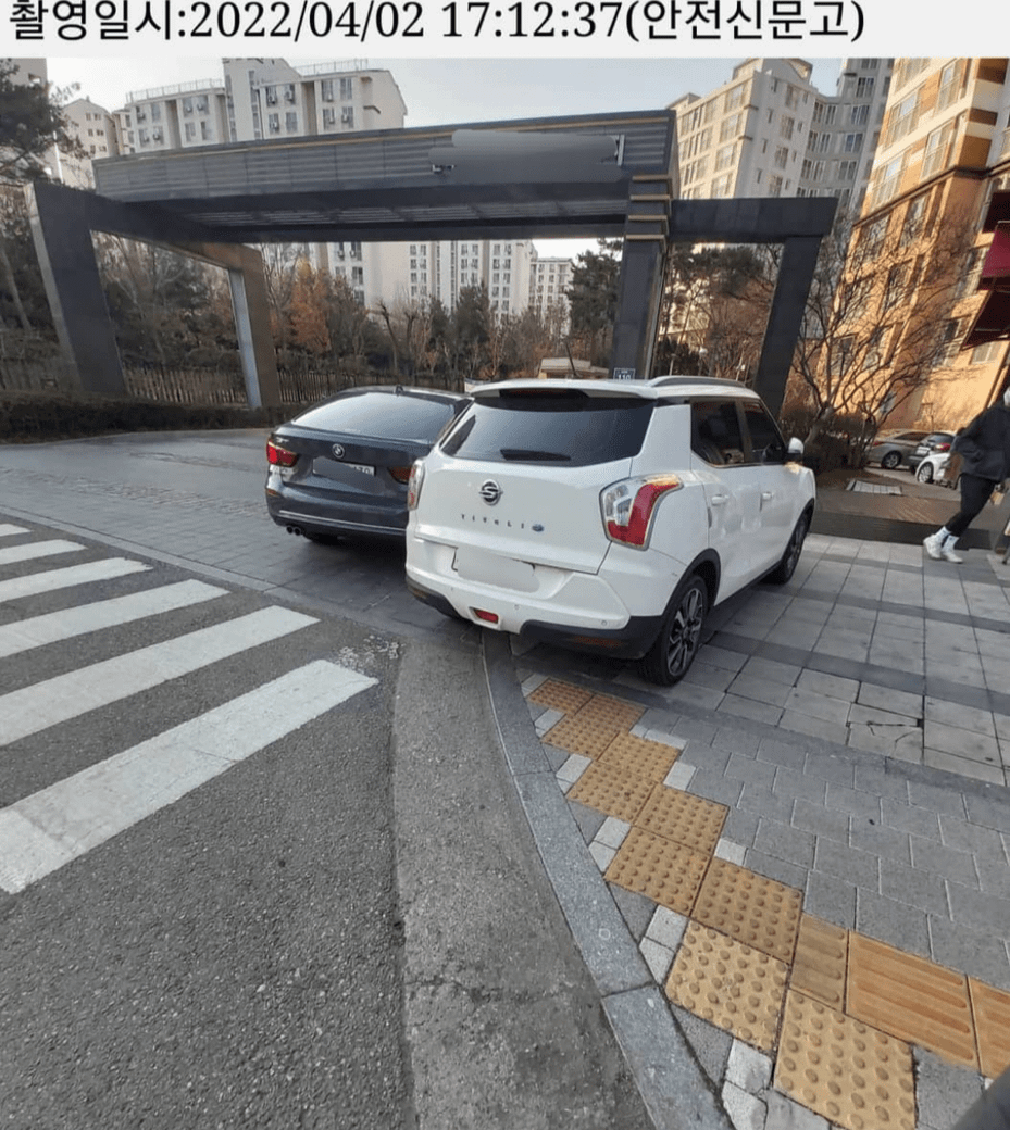 첨부한 사진을 보시면, 해당 구역은 인도 위에 주차를 하는 차량들이 항상 많습니다. 바로 옆은 초등학교고요.