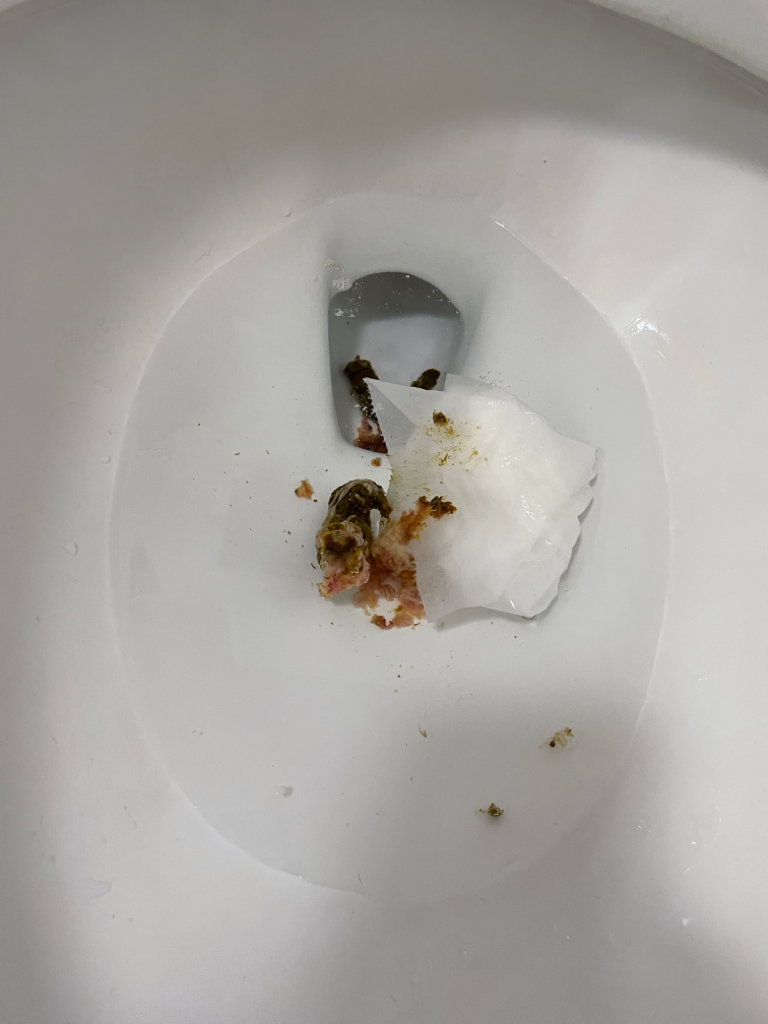 사진으로는 색이 살짝 진하게 보이는데 육안으로는 연분홍빛이 도는 변이구요, 1번째 사진이 오늘 본 두 번째 대변, 2번째 사진이 3번째 대변입니다.