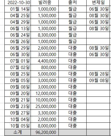 우선 빌려준 돈, 날짜 이력 및 제 대출현황은 아래 사진과 같습니다.