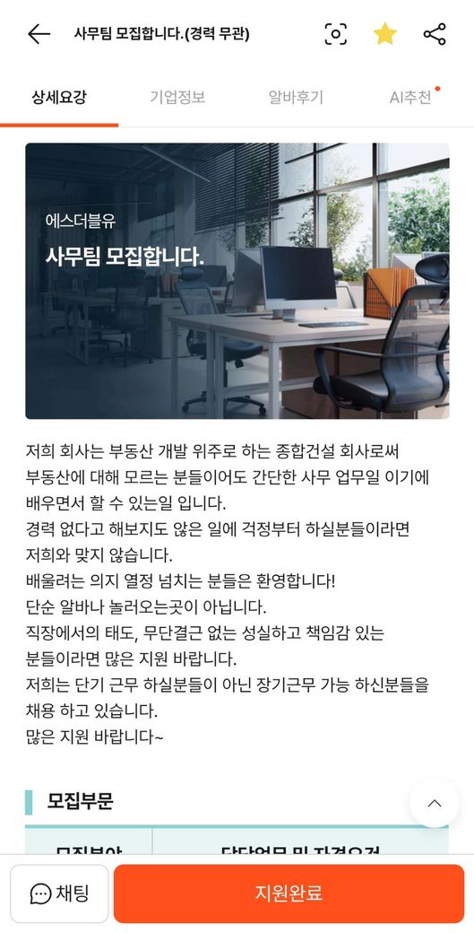 제가 얼마 전에 알바몬 구직공고에서 '에스더블유'라는 부동산 관련 쪽에서 사무직을 뽑는다는 공고를 보고 지원을 했고,면접을 보고 면접에서 합격을 하였습니다.그래서 저는 면접 합격 후 3일 동안 교육 이수 후 평가를 해서 최종 합격 여부를 결정한다고 해서 하루 교육을 들었습니다.오늘도 교육을 들으러 가야하는데 가서 일하는 것이 좋을까요?안전한 곳일까요?(에스더블유는 종합건설회사라고 합니다.)