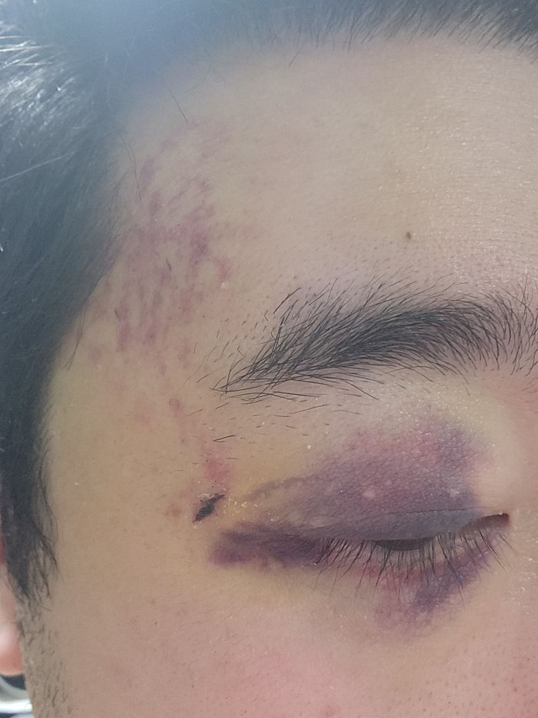 눈에 멍이 들었네요 이런 경우 의사들은 긴장을 합니다 빨리 병원을 가셔서 머리 검사를 받아보시기 바랍니다. 증상도 있으시고 하니 기다릴 이유는 없을 것 같습니다