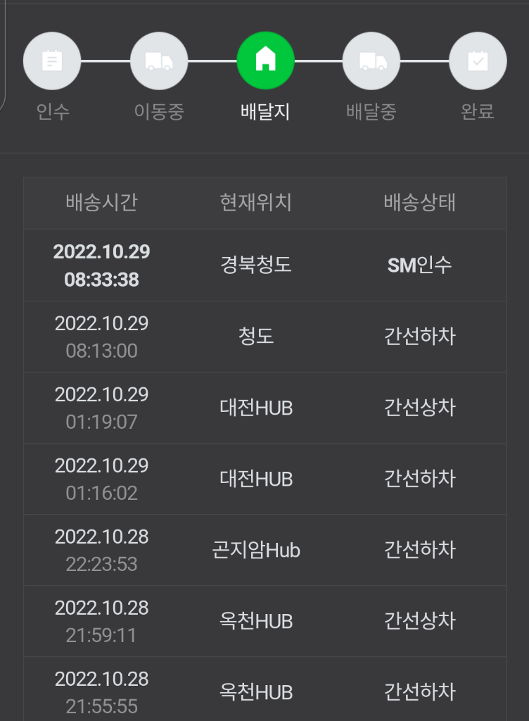 배송허브에 도착한것으로 보이며 주말이므로