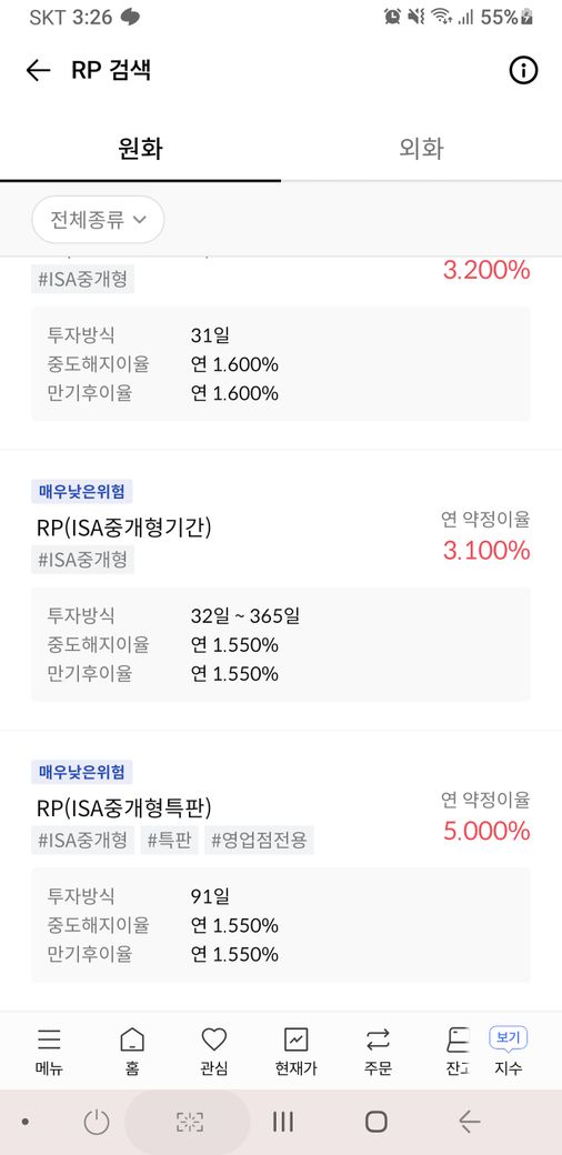 일단 RP는 일정기간 후 약정된 가격으로 회사가 다시 매수하는 조건이 붙어 있는 투자적격채권을 매수하고, 환매도 시 회사로부터 약정금리를 지급 받는 환매조건부 채권 상품으로 투자위험도가 매우 낮아서 투자해도 손해는 안볼 것이라 생각합니다.